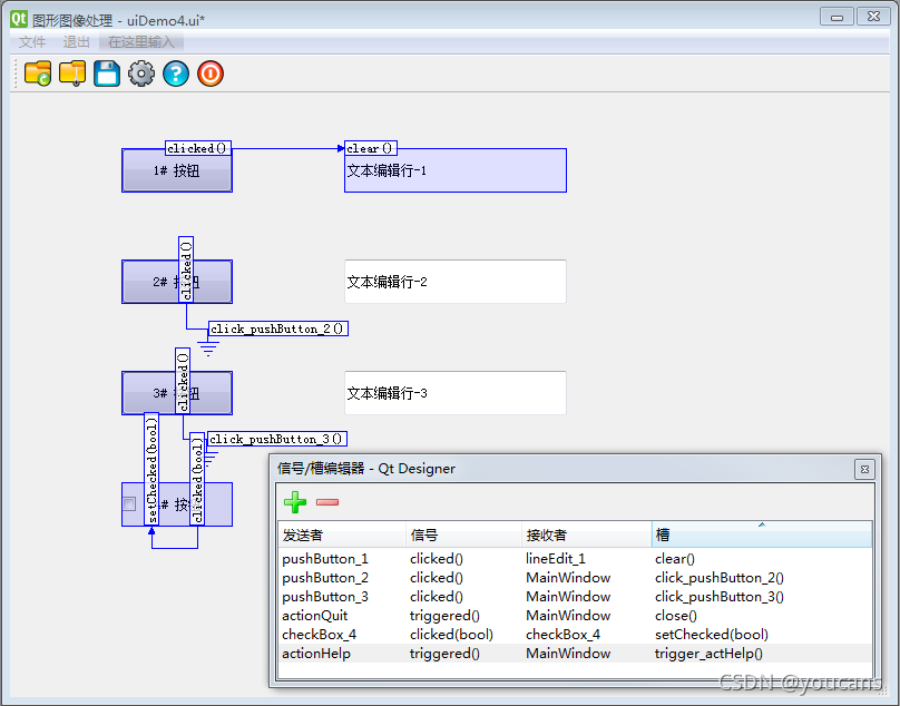 - 在 QtDesigner 將自定義函數(shù) trigger_actHelp() 添加到槽函數(shù)配置連接表中;