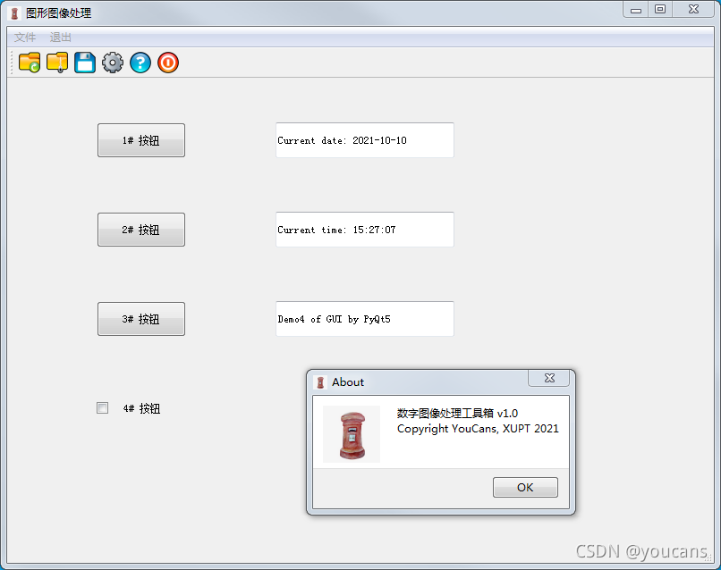 QMessageBox.about(self, "About", """數(shù)字圖像處理工具箱 v1.0\nCopyright YouCans, XUPT 2021""")