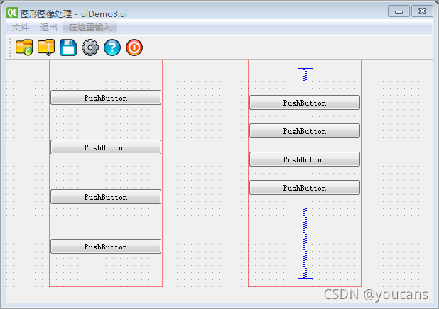 如下圖所示,在左側(cè)的垂直布局框中,多個按鈕控件在垂直方向排列,控件之間的間隔相同。在右側(cè)的垂直布局框的頂部和底部分別添加了一個間隔控制器,將按鈕控件調(diào)整到所需的位置。