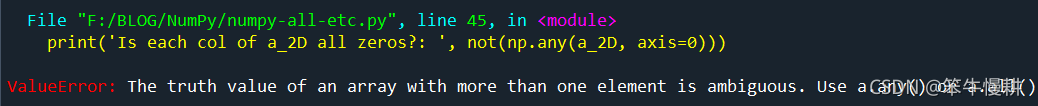 當指定axis=0時相當于對2維數(shù)組按列判斷是否全0,指定axis=1時相當于對2維數(shù)組按行判斷是否全0。當然,這里所說的行和列的概念是從傳統(tǒng)的2維數(shù)組或者矩陣里繼承而來的概念,當考慮更高維數(shù)組的時候,行和列這個概念就不再適用了。關(guān)于高維數(shù)組(也稱:Tensor,張量)的axis將另文介紹。