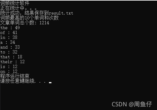 5)輸出詞頻最高的10個單詞和次數(shù)