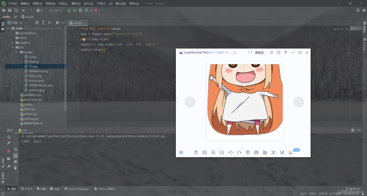 圖片裁剪用到的方法是image.crop(),這個(gè)方法能從圖像中提取出某個(gè)矩形大小的圖像。它接收一個(gè)四元素的元組作為參數(shù),各元素為(left, upper, right, lower),坐標(biāo)系統(tǒng)的原點(diǎn)(0, 0)是左上角。