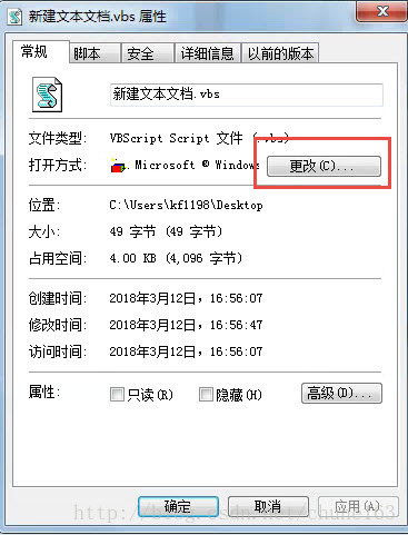 第二步如果,VBS屬性界面沒有更改按鈕的,可以右擊VBS腳本,選擇“打開方式”,效果是一樣的。