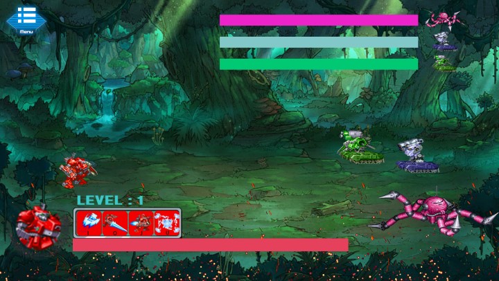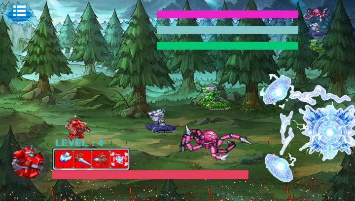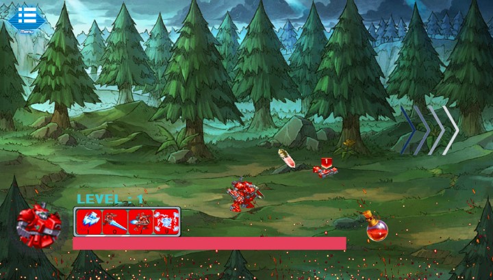 這款游戲只有一個(gè)關(guān)卡:但是一個(gè)關(guān)卡里面分為幾個(gè)小boss、打完即可通關(guān),顯示血量為0即可通關(guān)不成功。一只紅色的機(jī)甲作為玩家必須打敗出現(xiàn)的所有小機(jī)甲+小boss,每次敵方機(jī)甲死亡會(huì)掉落不同屬性的物品,比如:血包、裝備等等,靠近即可收取為自己可用。