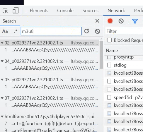 先打開(kāi)開(kāi)發(fā)者工具,然后搜索m3u8,會(huì)返回給你很多的ts的文件,像這種ts文件,就是視頻的片段