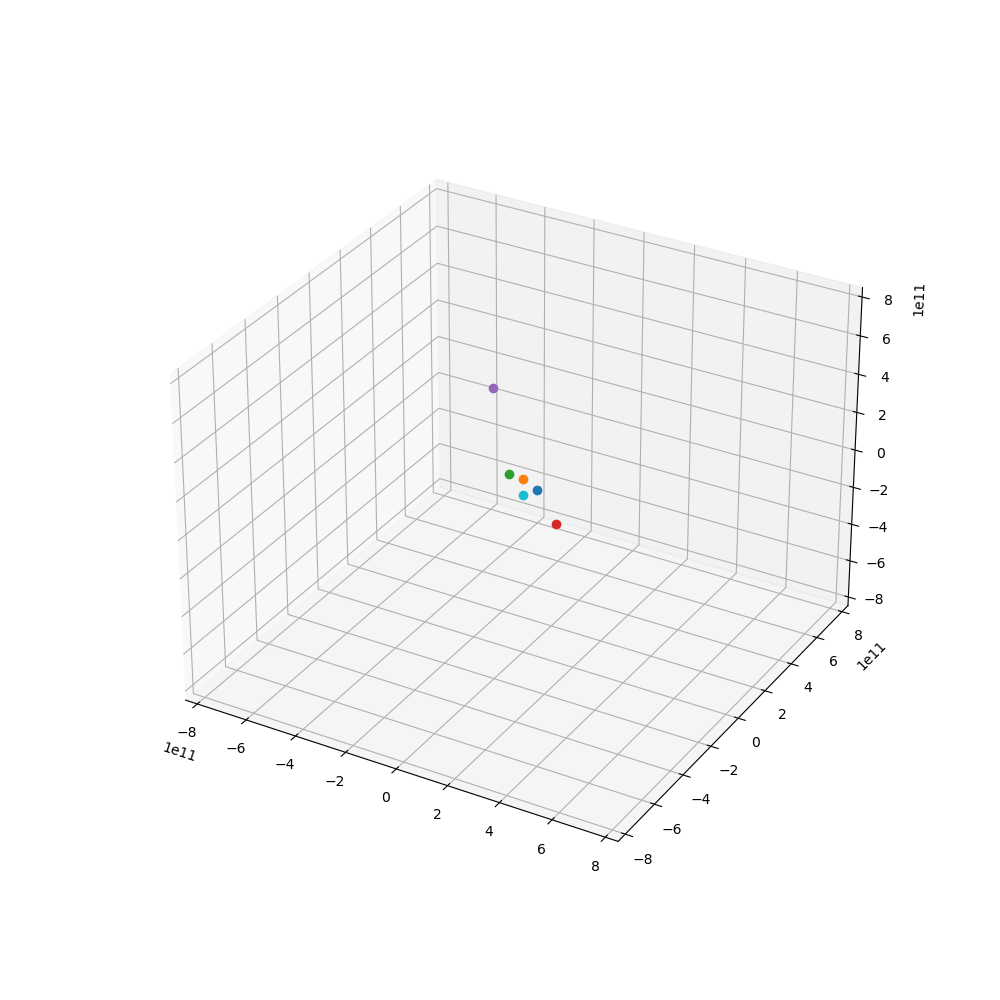 from os import cpu_count import numpy as np from numpy.random import rand import matplotlib.pyplot as plt from matplotlib import animation au,G,RE,ME = 1.48e11,6.67e-11,1.48e11,5.965e24 m = np.array([3.32e5,0.055,0.815,1,0.107,317.8])*ME*G r = np.array([0,0.387,0.723,1,1.524,5.203])*RE v = np.array([0,47.89,35.03,29.79,24.13,13.06])*1000 theta = rand(len(m))*np.pi*2 cTheta,sTheta = np.cos(theta), np.sin(theta) xyz = r*np.array([cTheta, sTheta, 0*r]) #位置三分量,因為參數(shù)太多,所以把這三個分量寫在了一起 uvw = v*np.array([-sTheta, cTheta, 0*v]) #速度三分量 N_ast = 100 m_ast = rand(N_ast)*1e20 r_ast = (rand(N_ast)*3.5+1.6)*RE v_ast = np.sqrt(G*3.32e5*ME/r_ast) #小行星速度sqrt(GM/R) theta = rand(N_ast)*np.pi*2 phi = (rand(N_ast)-0.5)*0.3 #給一個隨機的小傾角 cTheta,sTheta = np.cos(theta), np.sin(theta) cPhi,sPhi = np.cos(phi),np.sin(phi) xyza = r_ast*np.array([cTheta*cPhi, sTheta*cPhi, sPhi]) uvwa = v_ast*np.array([-sTheta*cPhi, cTheta*cPhi, sPhi]) name = "solar.gif" fig = plt.figure(figsize=(10,10)) ax = fig.add_subplot(projection='3d') ax.grid() ax.set_xlim3d([-5.5*RE,5.5*RE]) ax.set_ylim3d([-5.5*RE,5.5*RE]) ax.set_zlim3d([-5.5*RE,5.5*RE]) traces = [ax.plot([],[],[],'-', lw=0.5)[0] for _ in range(len(m))] pts = [ax.plot([],[],[],marker='o')[0] for _ in range(len(m))] pt_asts = [ax.plot([],[],[],marker='.')[0] for _ in range(N_ast)] N = 500 dt = 3600*50 ts = np.arange(0,N*dt,dt) xyzs,xyzas = [],[] for _ in ts: xyz_ij = (xyz.reshape(3,1,len(m))-xyz.reshape(3,len(m),1)) r_ij = np.sqrt(np.sum(xyz_ij**2,0)) xyza_ij = (xyz.reshape(3,1,len(m))-xyza.reshape(3,N_ast,1)) ra_ij = np.sqrt(np.sum(xyza_ij**2,0)) for j in range(len(m)): for i in range(len(m)): if i!=j : uvw[:,i] += m[j]*xyz_ij[:,i,j]*dt/r_ij[i,j]**3 for i in range(N_ast): uvwa[:,i] += m[j]*xyza_ij[:,i,j]*dt/ra_ij[i,j]**3 xyz += uvw*dt xyza += uvwa*dt xyzs.append(xyz.tolist()) xyzas.append(xyza.tolist()) xyzs = np.array(xyzs).transpose(2,1,0) xyzas = np.array(xyzas).transpose(2,1,0) def animate(n): for i in range(len(m)): xyz = xyzs[i] traces[i].set_data(xyz[0,:n],xyz[1,:n]) traces[i].set_3d_properties(xyz[2,:n]) pts[i].set_data(xyz[0,n],xyz[1,n]) pts[i].set_3d_properties(xyz[2,n]) for i in range(N_ast): pt_asts[i].set_data(xyzas[i,0,n],xyzas[i,1,n]) pt_asts[i].set_3d_properties(xyzas[i,2,n]) return traces+pts+pt_asts ani = animation.FuncAnimation(fig, animate, range(N), interval=10, blit=True) plt.show() ani.save(name)