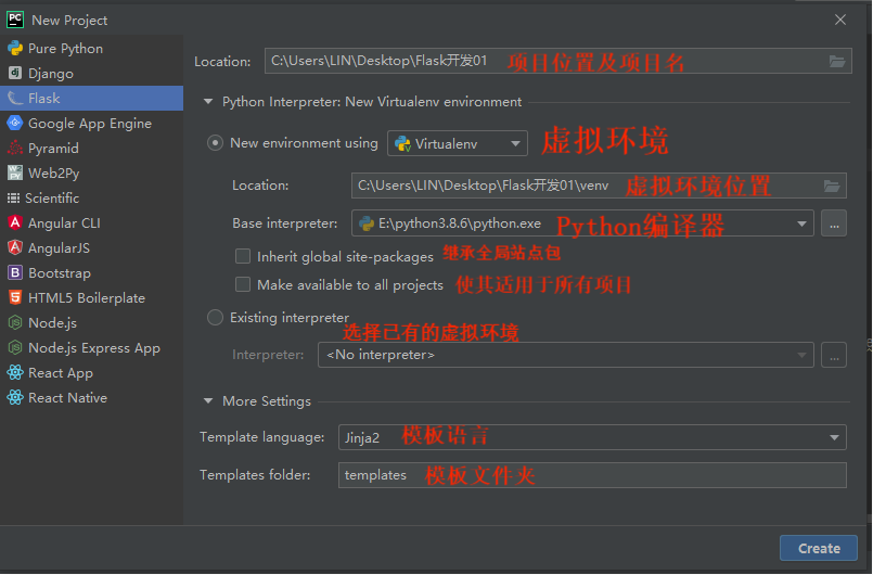 首先打開(kāi)PyCharm,創(chuàng)建我們第一個(gè)Flask項(xiàng)目,如下圖所示: