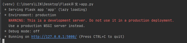 這兩種運(yùn)行方式主要是Environment結(jié)果不同,但也差不多,因?yàn)樵赥erminal里面運(yùn)行中,會(huì)有個(gè)WARNING警告,告訴我們這是一個(gè)開(kāi)發(fā)服務(wù)器,不要在生產(chǎn)部署中使用它。