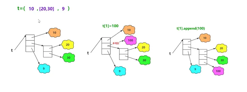 - 如果元組中存儲的對象本身為不可變對象,則不能引用其他對象