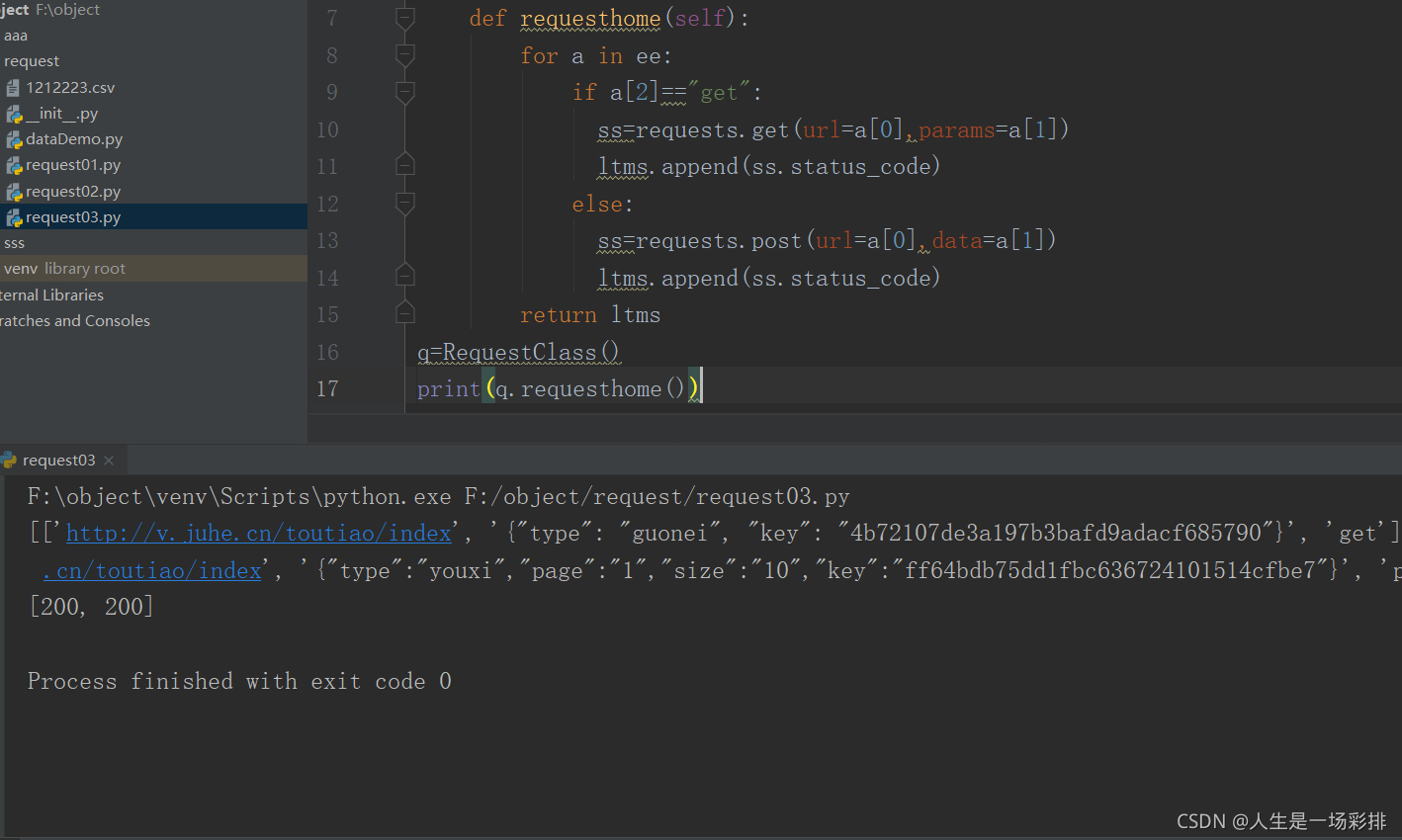 from request.dataDemo import ReadCsv import requests r=ReadCsv() ee=r.readCsv() ltms=[] class RequestClass: def requesthome(self): for a in ee: if a[2]=="get": ss=requests.get(url=a[0],params=a[1]) ltms.append(ss.status_code) else: ss=requests.post(url=a[0],data=a[1]) ltms.append(ss.status_code) return ltms q=RequestClass() print(q.requesthome())