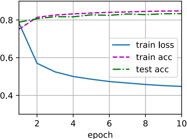 在這里,我們使用學(xué)習(xí)率為0.1的小批量隨機(jī)梯度下降作為優(yōu)化算法。這與我們在線性回歸例子中的相同,這說明了優(yōu)化器的普適性。