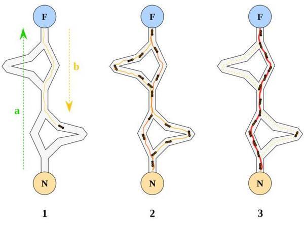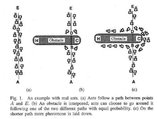 在圖(a)中,有一群螞蟻,假如A是蟻巢,E是食物源(反之亦然)。這群螞蟻將沿著蟻巢和食物源之間的直線路徑行駛。假如在A和E之間突然出現(xiàn)了一個(gè)障礙物(圖(b)),那么,在B點(diǎn)(或D點(diǎn))的螞蟻將要做出決策,到底是向左行駛還是向右行駛?由于一開(kāi)始路上沒(méi)有前面螞蟻留下的 信息素(pheromone) ,螞蟻朝著兩個(gè)方向行進(jìn)的概率是相等的。但是當(dāng)有螞蟻?zhàn)哌^(guò)時(shí),它將會(huì)在它行進(jìn)的路上釋放出信息素,并且這種信息素會(huì)議一定的速率散發(fā)掉。信息素是螞蟻之間交流的工具之一。它后面的螞蟻通過(guò)路上信息素的濃度,做出決策,往左還是往右。很明顯,沿著短邊的的路徑上信息素將會(huì)越來(lái)越濃(圖(c)),從而吸引了越來(lái)越多的螞蟻沿著這條路徑行駛。