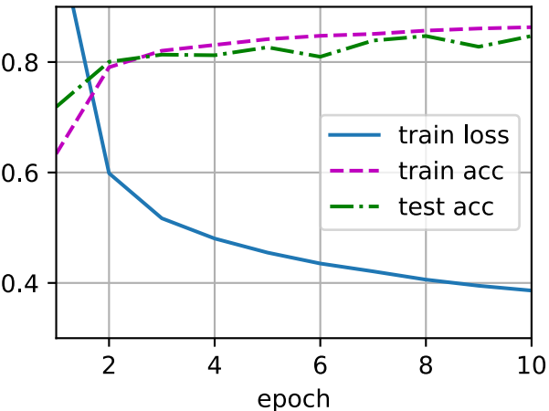 num_epochs, lr = 10, 0.1 updater = torch.optim.SGD(params, lr=lr) d2l.train_ch3(net, train_iter, test_iter, loss, num_epochs, updater)