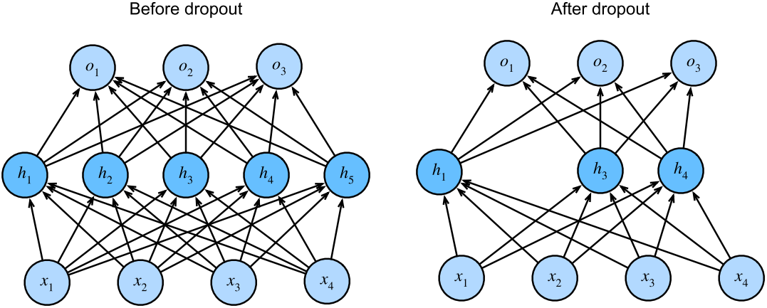 之前多層感知機(jī)是帶有一個(gè)隱藏層和5個(gè)隱藏單元的。當(dāng)我們將dropout應(yīng)用到隱藏層時(shí),以 p的概率將隱藏單元置為零時(shí),結(jié)果可以看作是一個(gè)只包含原始神經(jīng)元子集的網(wǎng)絡(luò)。右圖中,刪除了 h2和 h5。因此,輸出的計(jì)算不再依賴于 h2或 h5,并且它們各自的梯度在執(zhí)行反向傳播時(shí)也會(huì)消失。這樣,輸出層的計(jì)算不能過(guò)度依賴于 h1,…,h5的任何一個(gè)元素。