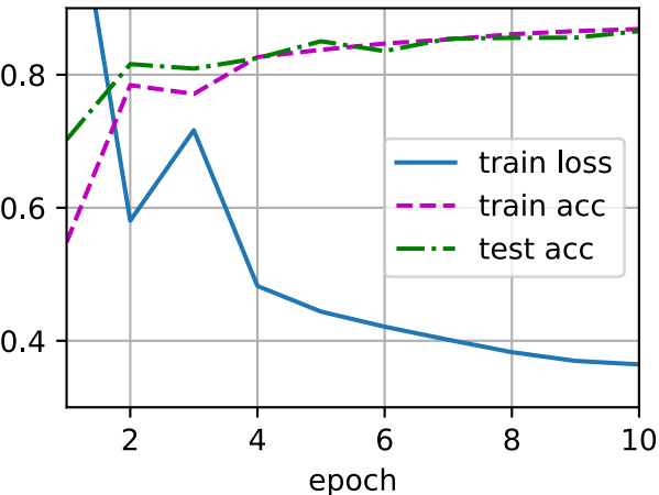 trainer = torch.optim.SGD(net.parameters(), lr=lr) d2l.train_ch3(net, train_iter, test_iter, loss, num_epochs, trainer)