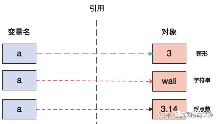 執(zhí)行中分別創(chuàng)建了整數(shù)類型的對(duì)象3,字符串的對(duì)象“wali”以及浮點(diǎn)數(shù)的對(duì)象3.14,變量a并不擁有這些類型,只是簡(jiǎn)單的通過引用分別指向了三個(gè)對(duì)象。