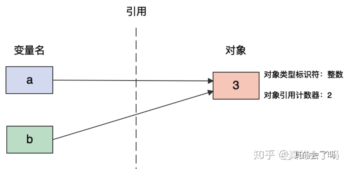 可能聰明的讀者已經(jīng)心里默默計(jì)算出對(duì)于對(duì)象3的引用計(jì)數(shù)器的值為2,分別為變量a和變量b對(duì)對(duì)象3的引用。是的,引用計(jì)數(shù)器的定義就是這么明了,用于表征用于指向同一個(gè)對(duì)象的引用的個(gè)數(shù)。通過變量間的賦值操作,自動(dòng)的計(jì)算對(duì)象的引用計(jì)數(shù)。