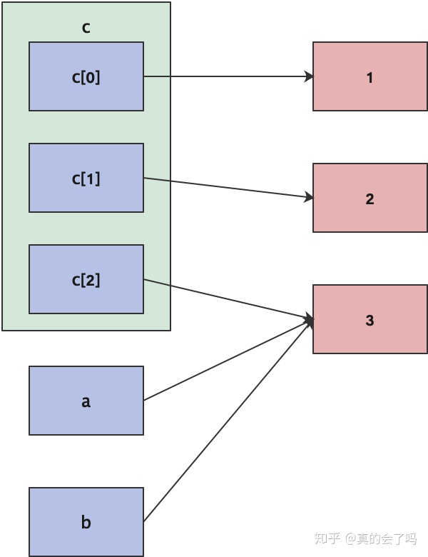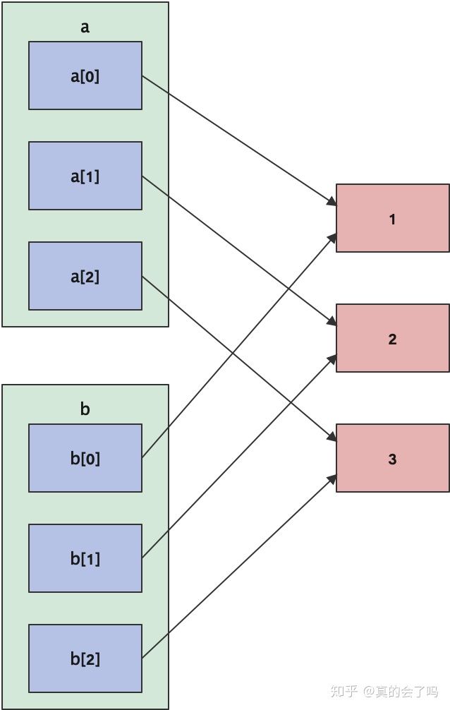 在例子3中變量a和b的所指向的對(duì)象為可變對(duì)象,并且a和b的地址不一樣,但是a和b中的元素所指向的對(duì)象其實(shí)是一樣的,如下圖所示