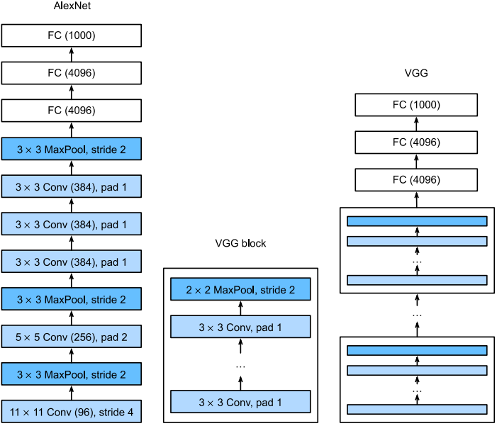 在最初的VGG論文中,作者使用了帶有 3 × 3卷積核、填充為1(保持高度和寬度)的卷積層,和帶有 2 × 2 池化窗口、步幅為2(每個塊后的分辨率減半)的最大匯聚層。
