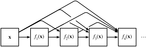 最后,將這些展開式結(jié)合到多層感知機中,再次減少特征的數(shù)量。實現(xiàn)起來非常簡單:我們不需要添加術(shù)語,而是將它們連接起來。DenseNet這個名字由變量之間的“稠密連接”而得來,最后一層與之前的所有層緊密相連。稠密連接如下圖所示:
