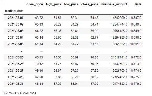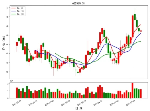 我們從恒有數(shù)金融數(shù)據(jù)社區(qū),獲取股票市場歷史行,情數(shù)據(jù)。我們獲取2021年3月1號至2021年6月1號,恒生電子(600570.SH)的日行情數(shù)據(jù),并做簡單處理,代碼及執(zhí)行結(jié)果如下。