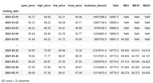 #3、計算均值 data_price['MA5']=data_price['close_price'].rolling(window=5).mean() data_price['MA10']=data_price['close_price'].rolling(window=10).mean() data_price['MA20']=data_price['close_price'].rolling(window=20).mean() data_price title=