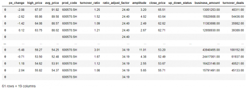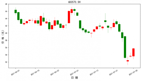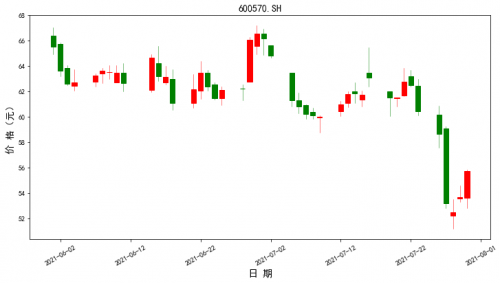 我們從恒有數(shù)金融數(shù)據(jù)社區(qū),獲取股票市場(chǎng)歷史行情數(shù)據(jù)。我們獲取2021年6月1號(hào)至2021年8月1號(hào),恒生電子(600570.SH)的日行情數(shù)據(jù),代碼及執(zhí)行結(jié)果如下。