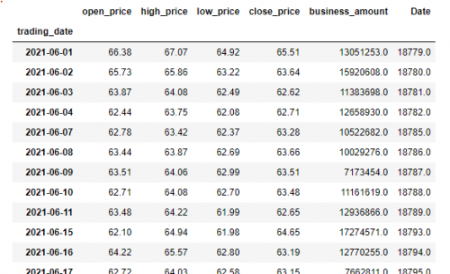 ,'business_amount']]# 選取日期、高開低收價(jià)格、成交量數(shù)據(jù)
