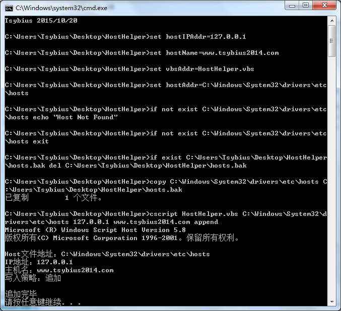 這個(gè)VBS腳本的功能,是傳入hosts文件地址、IP地址、主機(jī)名,并指定寫(xiě)入策略(包括覆蓋、追加),執(zhí)行該腳本后會(huì)自動(dòng)配置hosts文件。