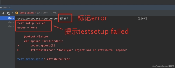 test_order被標(biāo)記Error,并且信息提示:test setup failed,說(shuō)明是調(diào)用的fixture函數(shù)存在問(wèn)題,且說(shuō)明了錯(cuò)誤原因。