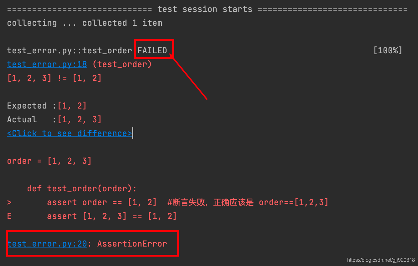 test_order被標(biāo)記failed,且提醒是AssertionError,斷言出錯(cuò)。這說(shuō)明是test_order 本身運(yùn)行未通過(guò)。
