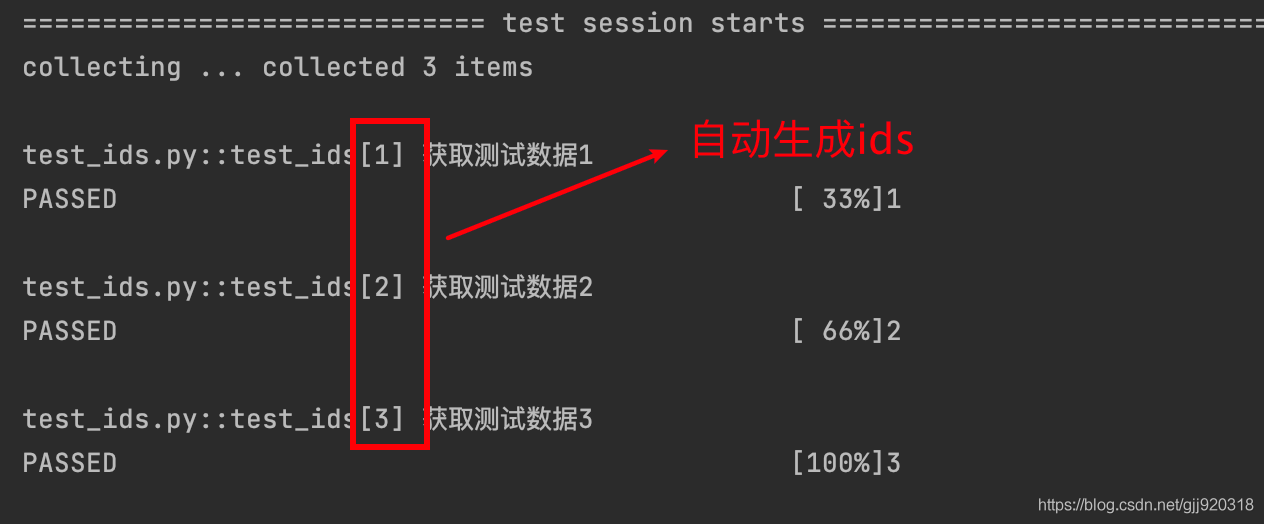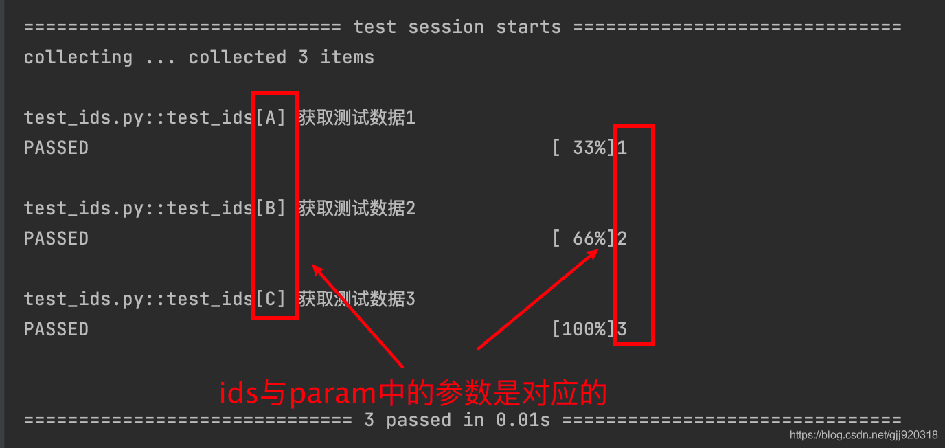 在執(zhí)行信息中,我們可以發(fā)現(xiàn)ids的三個(gè)參數(shù)和params的三個(gè)參數(shù)一一對(duì)應(yīng)顯示,并且ids的參數(shù)作為測(cè)試用例id的一部分呈現(xiàn)出來(lái)。