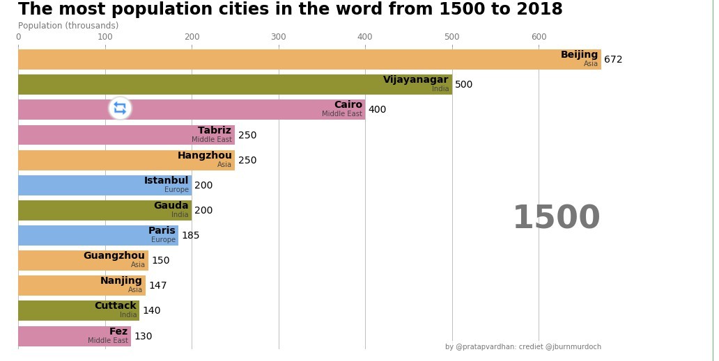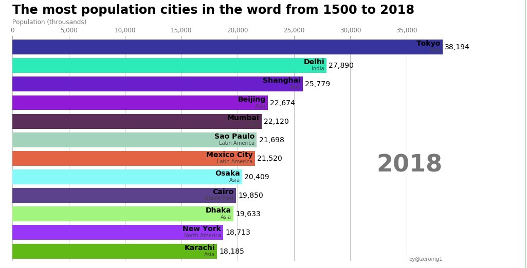 ax.text(0,1.15,'The most population cities in the word from 1500 to 2018',