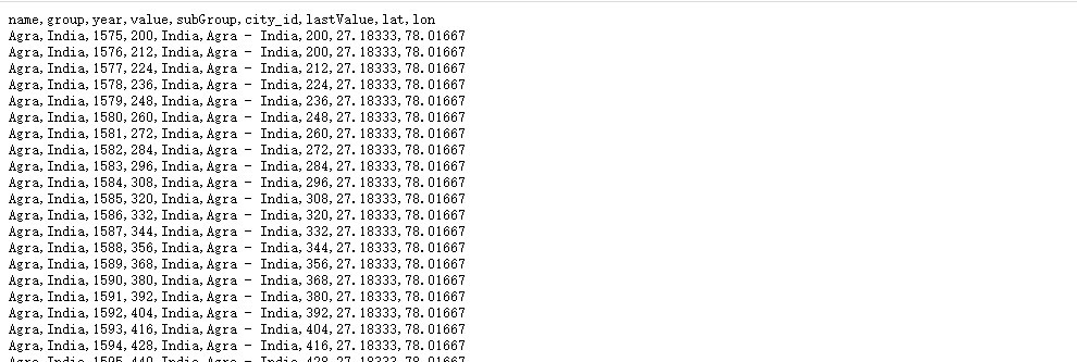 本次選取的數(shù)據(jù)為從1500年到2018年各地區(qū)的人數(shù)統(tǒng)計(jì)(提醒一下,是各城市所在區(qū)域人口數(shù)量)