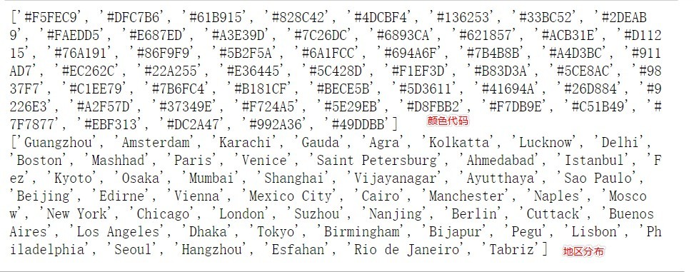 最后構(gòu)造兩個(gè)字典:一個(gè)是城市與顏色之間的,一個(gè)是城市與所在區(qū)域(亞洲、歐洲等)之間的,
