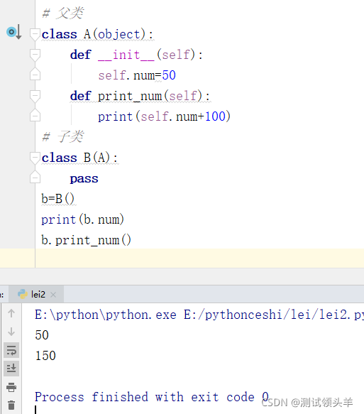 # 父類 class A(object): def __init__(self): self.num=50 def print_num(self): print(self.num+100) # 子類 class B(A): pass b=B() print(b.num) b.print_num()