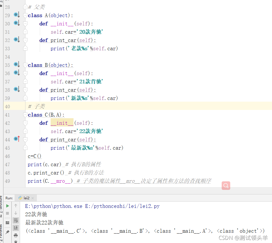 print(C.__mro__) # 子類的魔法屬性__mro__決定了屬性和方法的查找順序
