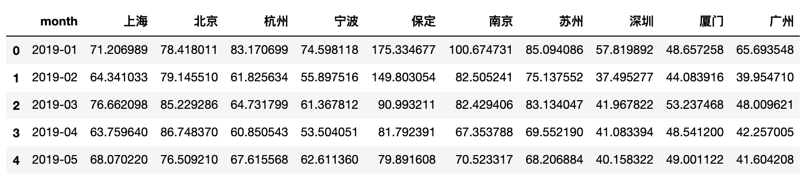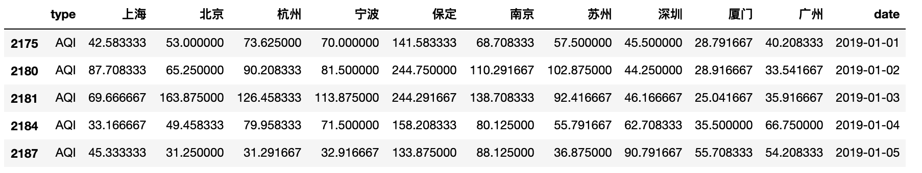 可以看出,在數(shù)據(jù)幀中,按照每一天為行,記錄了當(dāng)天幾個(gè)城市的AQI值。