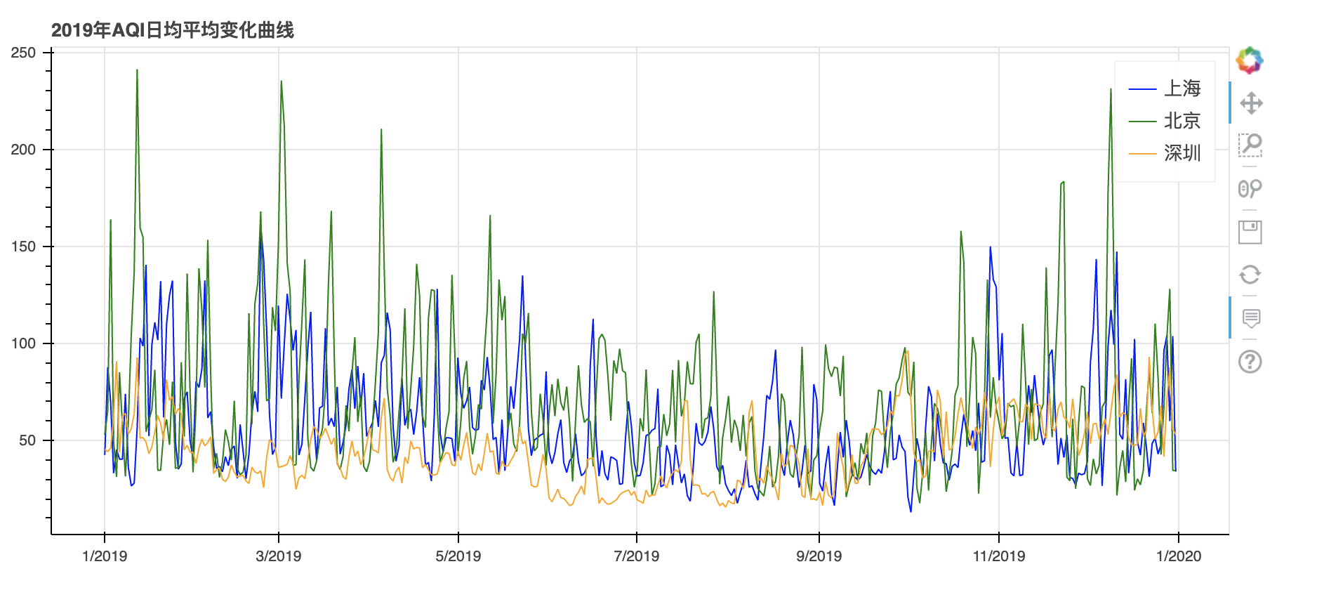p.add_tools(HoverTool(tooltips=[("時(shí)間", "@month"), ("上海平均AQI", "@{上海}"), ("北京平均AQI", "@{北京}"), ("深圳平均AQI", "@{深圳}")]))