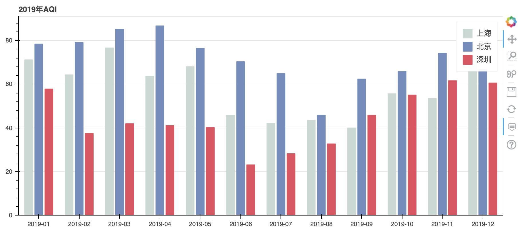 數(shù)據(jù)集處理結(jié)果符合我們的預(yù)期,接下來使用這個(gè)數(shù)據(jù)集繪制第二張圖表。因?yàn)槲覀兿胍容^不同城市同一個(gè)月的AQI,因此我們的柱狀圖需要分組顯示,這里使用了bokeh中的dodge方式,每一個(gè)dodge為一個(gè)城市的數(shù)據(jù),并指明了在圖表上的相對(duì)位置。