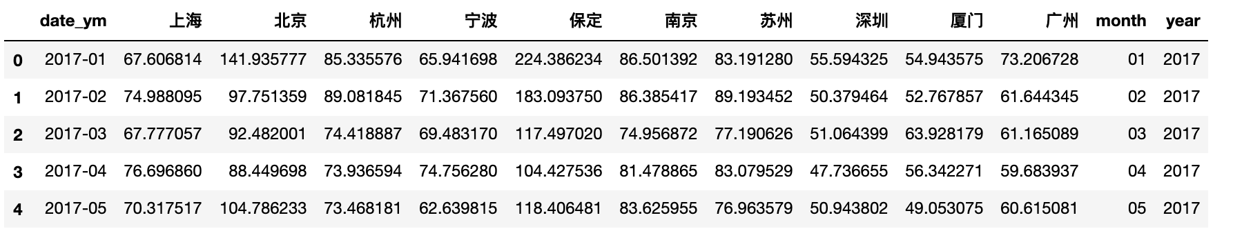 我已經(jīng)將數(shù)據(jù)集進(jìn)行過清理,數(shù)據(jù)集中包含規(guī)整的從2017年到2019年的各個(gè)城市的日AQI平均值。