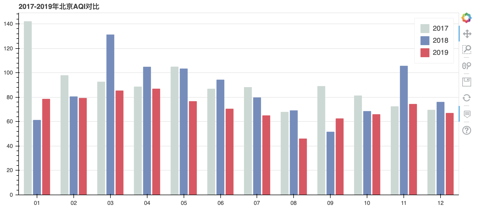 p = figure(x_range=list(df_2017['month']), title="2017-2019年北京AQI對(duì)比", plot_width=1150, plot_height=400)