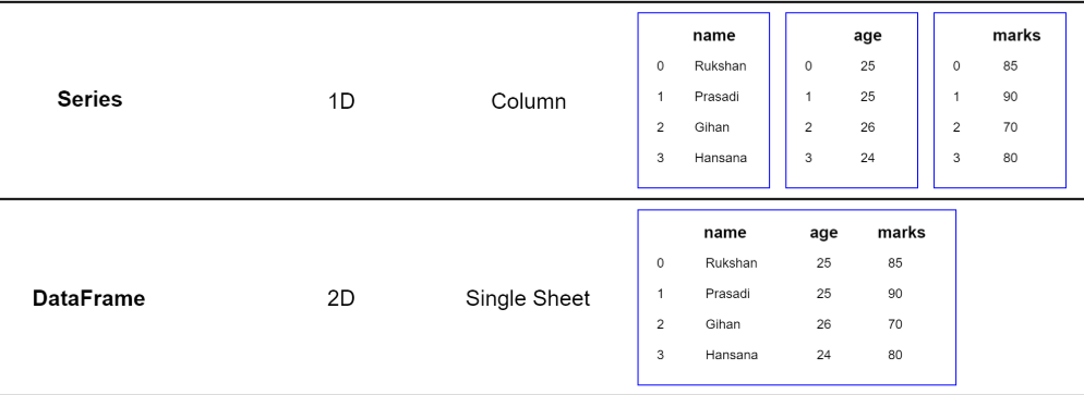 可以看出,利用Series只能存儲(chǔ)一種類型的數(shù)據(jù),比如說name series存儲(chǔ)的數(shù)據(jù)是字符串類型,而age series存儲(chǔ)的數(shù)據(jù)是整數(shù)型。如果我們想把name,age,marks存儲(chǔ)在一個(gè)數(shù)據(jù)結(jié)構(gòu)里,我們就需要使用DataFrame,從圖中看出,DataFrame類似于一個(gè)表格數(shù)據(jù),有行有列,行跟Series的行一致,是數(shù)據(jù)的標(biāo)簽,而每一列就是原來的每一個(gè)Series。