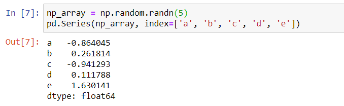 np_array = np.random.randn(5) pd.Series(np_array, index=['a', 'b', 'c', 'd', 'e'])