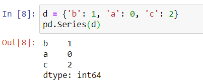 上邊這段代碼,我們先創(chuàng)建了一個(gè)Python地點(diǎn)d,然后將這個(gè)字典傳遞給pd.Series來創(chuàng)建一個(gè)Pandas Series,運(yùn)行結(jié)果為: