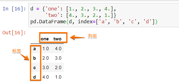 我們把d這個(gè)Python字典傳遞給pd.DataFrame來創(chuàng)建新的DataFrame,同時(shí)我們可以通過指定index來指定DataFrame的行名(標(biāo)簽),上邊代碼的輸出為