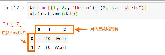 data = [(1, 2., 'Hello'), (2, 3., "World")] pd.DataFrame(data)