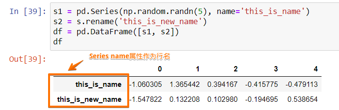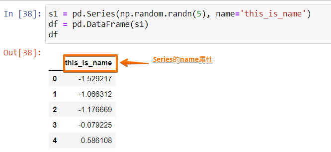 s1 = pd.Series(np.random.randn(5), name='this_is_name') df = pd.DataFrame(s1) df