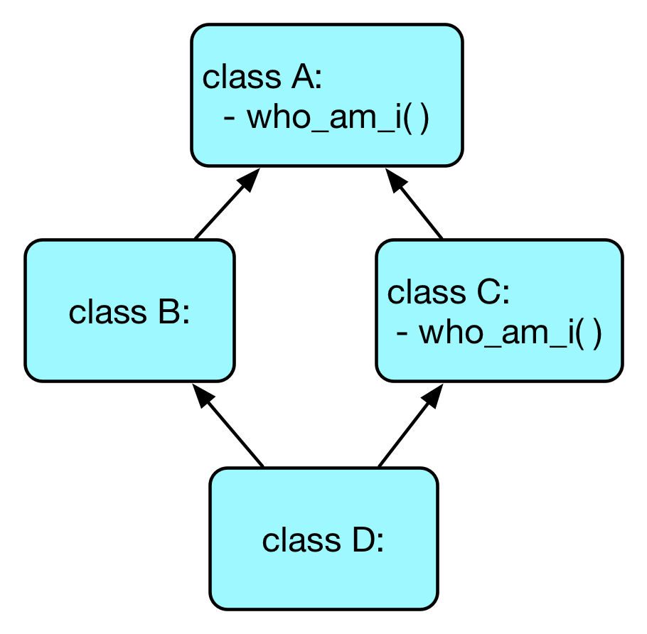 >>> d.who_am_i() I am C >>> D.__mro__ (<class 'test.D'>, <class 'test.B'>, <class 'test.C'>, <class 'test.A'>, <class 'object'>)