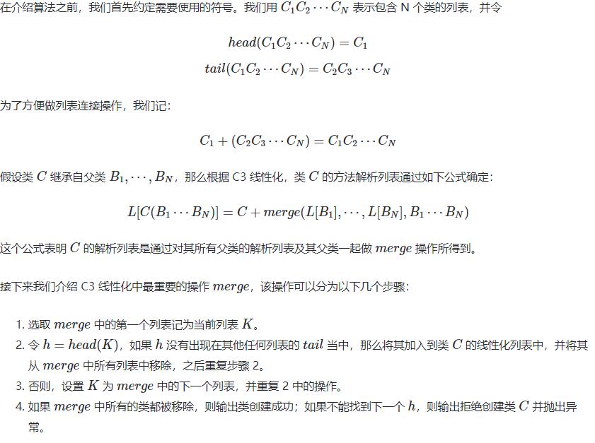 上一小結(jié)我們從直觀上概述了針對 new-style class 的 MRO 算法過程。事實上這個算法有一個明確的名字 C3 linearization。下面我們給出其形式化的計算過程。